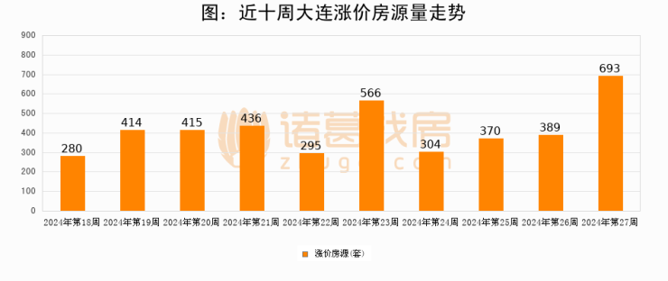 从调价房源来看,第27周大连涨价房源693套,较上周上涨78.1%。与此同时,27周涨价房源占比提升5.08个百分点,业主信心持续恢复。
