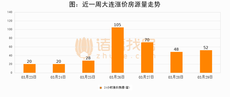 根据诸葛找房数据显示,大连24小时涨价房源量为52套,较03月28日增加4套,环比上涨8.3%。与此同时,涨价房源占比小幅扩大,业主信心有所提升。