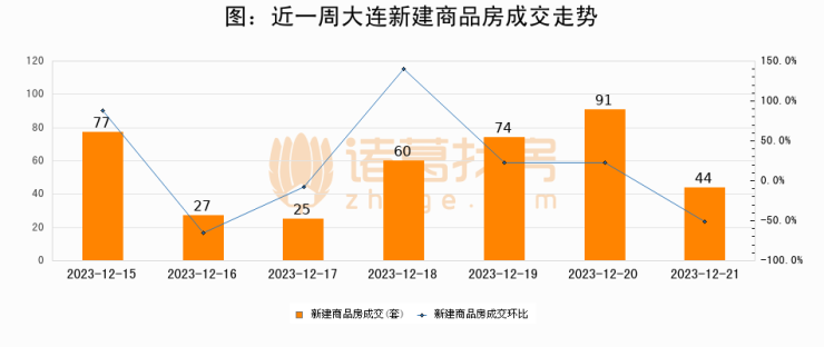 根据大连市住房保障和房屋管理局数据显示,2023年12月21日大连新建商品房成交44套,较昨日减少47套,环比下降51.6%