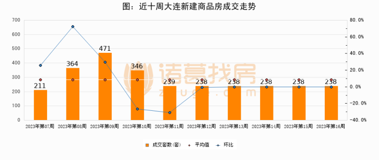 进入2023年第16周(04月10日-04月16日),大连新建商品房成交238套,较上周持平