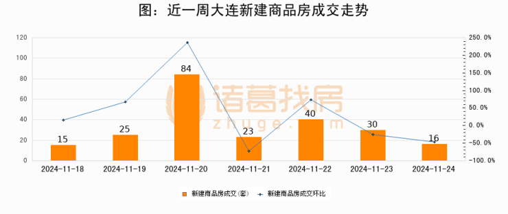 根据大连市住房保障和房屋管理局数据显示,2024年11月24日大连新建商品房成交16套,较昨日减少14套,环比下降46.7%