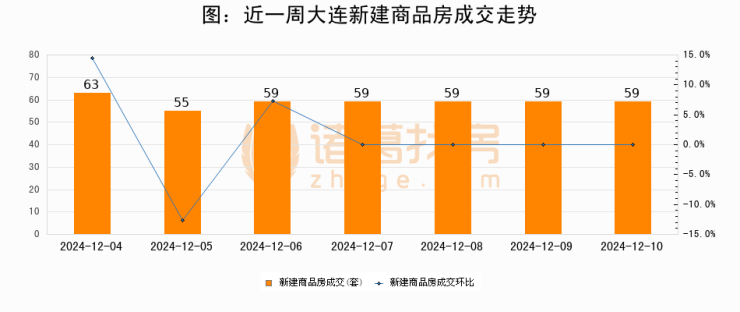 根据大连市住房保障和房屋管理局数据显示,2024年12月10日大连新建商品房成交59套,较昨日持平