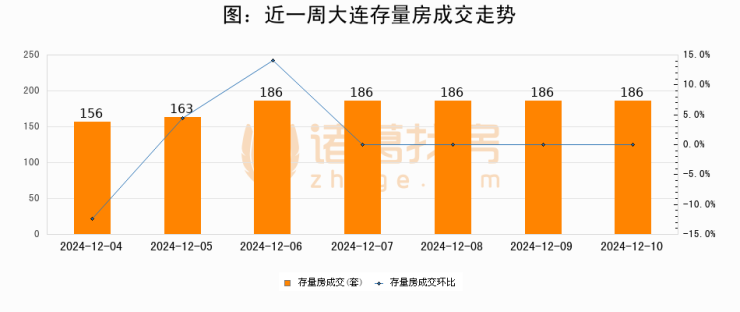 从存量房来看,2024年12月10日大连存量房单日成交186套,比昨日持平。。从近一周存量房成交来看,大连存量房日均成交套数为178套,12月10日单日成交186套,高于近一周平均水平4.5%。