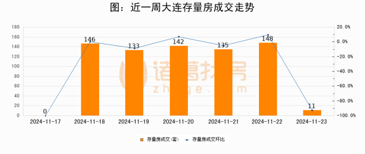 从存量房来看,2024年11月23日大连存量房单日成交11套,比昨日减少137套,环比下降92.6%。从近一周存量房成交来看,大连存量房日均成交套数为102套,11月23日单日成交11套,低于近一周平均水平89.2%。