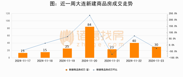 根据大连市住房保障和房屋管理局数据显示,2024年11月23日大连新建商品房成交30套,较昨日减少10套,环比下降25%