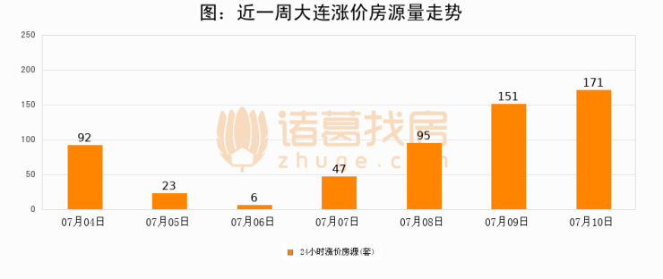 根据诸葛找房数据显示,大连24小时涨价房源量为171套,较07月09日增加20套,环比上涨13.2%。与此同时,涨价房源占比小幅扩大,业主信心有所提升。