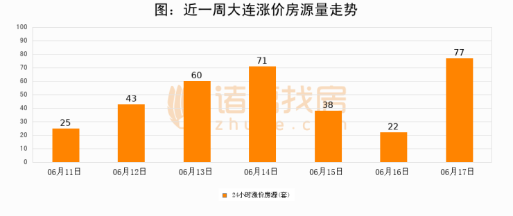 根据诸葛找房数据显示,大连24小时涨价房源量为77套,较06月16日增加55套,环比上涨250%。与此同时,涨价房源占比小幅扩大,业主信心有所提升。