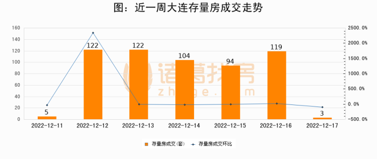 从存量房来看,2022年12月17日大连存量房单日成交3套,比昨日减少116套,环比下降97.5%。从近一周存量房成交来看,大连存量房日均成交套数为81套,其中12月12日成交量最高为122套,12月17日单日成交3套,低于近一周平均水平96.3%。