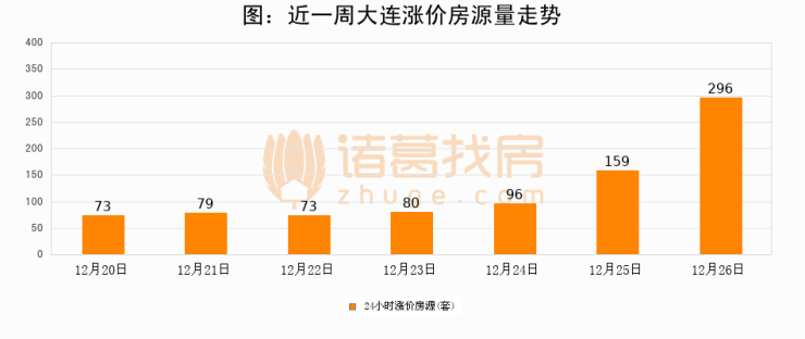 根据诸葛找房数据显示,大连24小时涨价房源量为296套,较12月25日增加137套,环比上涨86.2%。与此同时,涨价房源占比小幅扩大,业主信心有所提升。