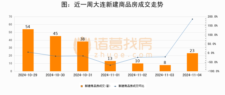 根据大连市住房保障和房屋管理局数据显示,2024年11月04日大连新建商品房成交23套,较昨日增加15套,环比上涨187.5%