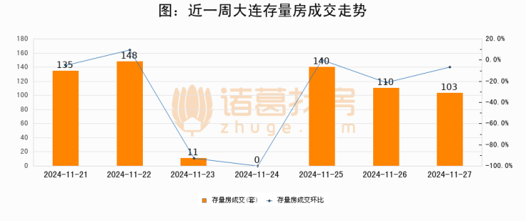从存量房来看,2024年11月27日大连存量房单日成交103套,比昨日减少7套,环比下降6.4%。从近一周存量房成交来看,大连存量房日均成交套数为92套,11月27日单日成交103套,高于近一周平均水平12%。