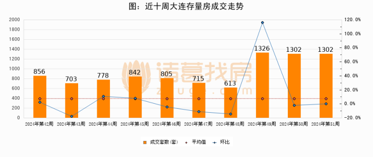 存量房方面,第51周大连存量房成交1302套,较上周持平。从近十周成交走势来看,周均成交套数为924套,本周高于平均水平40.9%。