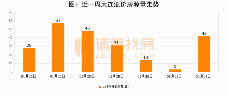 根据诸葛找房数据显示,大连24小时涨价房源量为42套,较01月31日增加39套,环比上涨1300%。与此同时,涨价房源占比小幅扩大,业主信心有所提升。