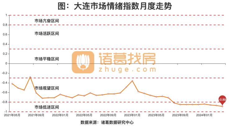 根据诸葛找房数据研究中心监测数据显示,2024年04月,大连市场情绪指数为-0.89,较上月下降0.02,位于市场低迷区间。