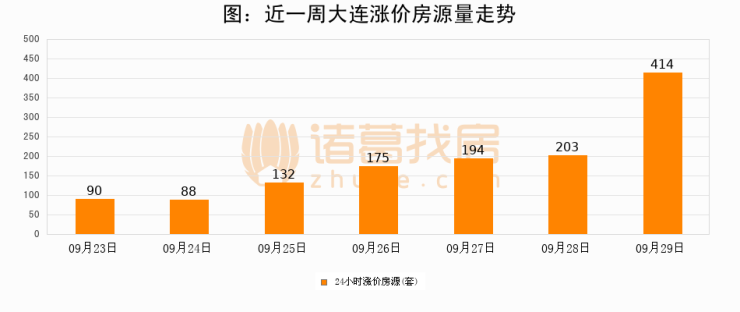 根据诸葛找房数据显示,大连24小时涨价房源量为414套,较09月28日增加211套,环比上涨103.9%。与此同时,涨价房源占比小幅扩大,业主信心有所提升。