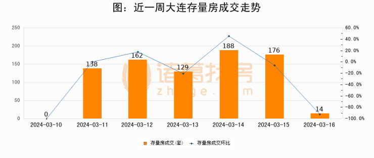 从存量房来看,2024年03月16日大连存量房单日成交14套,比昨日减少162套,环比下降92%。从近一周存量房成交来看,大连存量房日均成交套数为115套,03月16日单日成交14套,低于近一周平均水平87.8%。