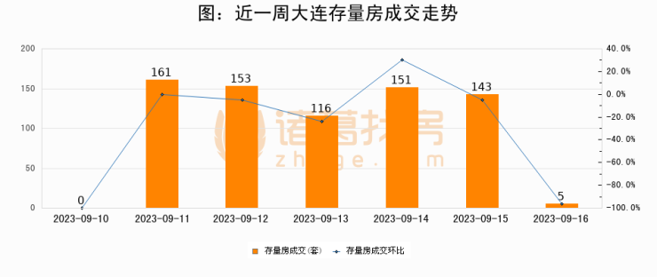 从存量房来看,2023年09月16日大连存量房单日成交5套,比昨日减少138套,环比下降96.5%。从近一周存量房成交来看,大连存量房日均成交套数为104套,09月16日单日成交5套,低于近一周平均水平95.2%。