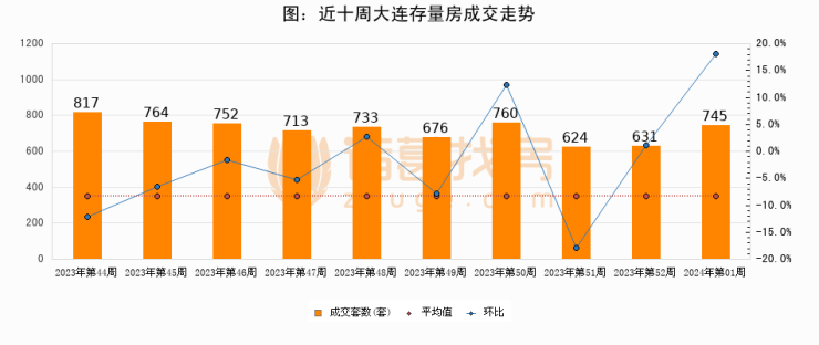 存量房方面,第52周大连存量房成交745套,较上周增加114套,环比上涨18.1%。从近十周成交走势来看,周均成交套数为721套,本周高于平均水平3.3%。