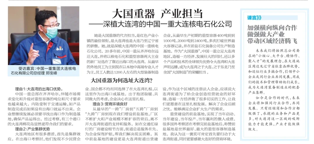 作为中国一重集团大连核电石化有限公司的总经理,郑宝峰在大连日报特别采访时表示,产业做强做优、配套更齐全、有更多就业机会、人文环境配套水平提高,员工就近居住成为可能。