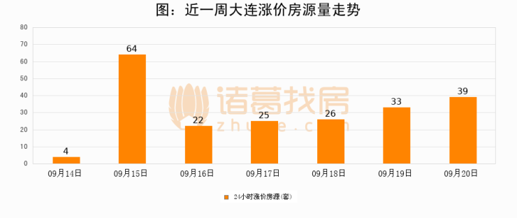 根据诸葛找房数据显示,大连24小时涨价房源量为39套,较09月19日增加6套,环比上涨18.2%。与此同时,涨价房源占比小幅扩大,业主信心有所提升。