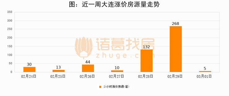 根据诸葛找房数据显示,大连24小时涨价房源量为5套,较02月29日减少263套,环比下降98.1%。与此同时,涨价房源占比小幅回落,对于购房者来说是一个入市窗口期,购房者可抓住时机入市。