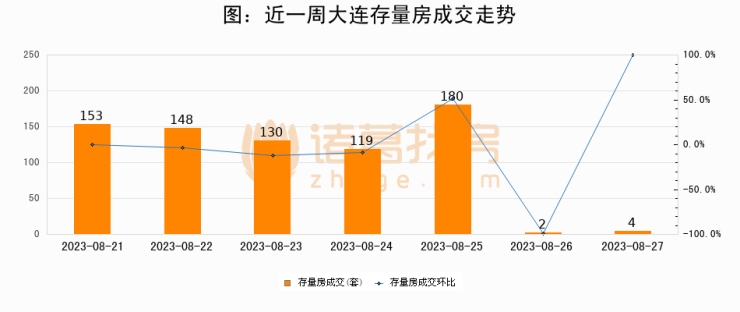 从存量房来看,2023年08月27日大连存量房单日成交4套,比昨日增加2套,环比上涨100%。从近一周存量房成交来看,大连存量房日均成交套数为105套,08月27日单日成交4套,低于近一周平均水平96.2%。
