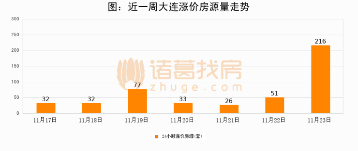 根据诸葛找房数据显示,大连24小时涨价房源量为216套,较11月22日增加165套,环比上涨323.5%。与此同时,涨价房源占比小幅扩大,业主信心有所提升。