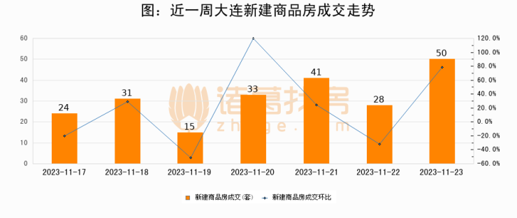根据大连市住房保障和房屋管理局数据显示,2023年11月23日大连新建商品房成交50套,较昨日增加22套,环比上涨78.6%
