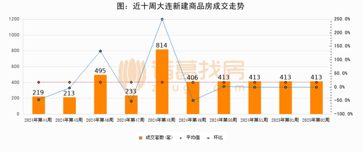 进入2025年第02周(01月06日-01月12日),大连新建商品房成交413套,较上周持平