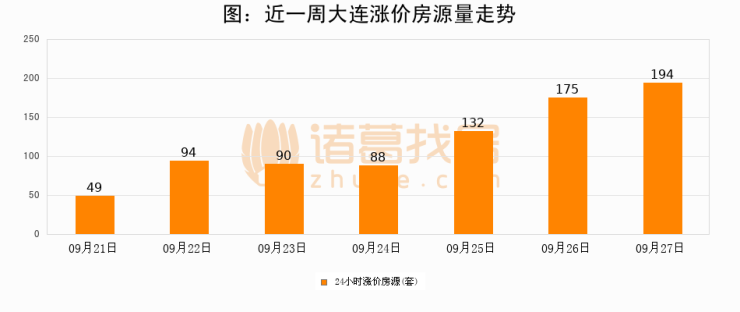 根据诸葛找房数据显示,大连24小时涨价房源量为194套,较09月26日增加19套,环比上涨10.9%。与此同时,涨价房源占比小幅扩大,业主信心有所提升。