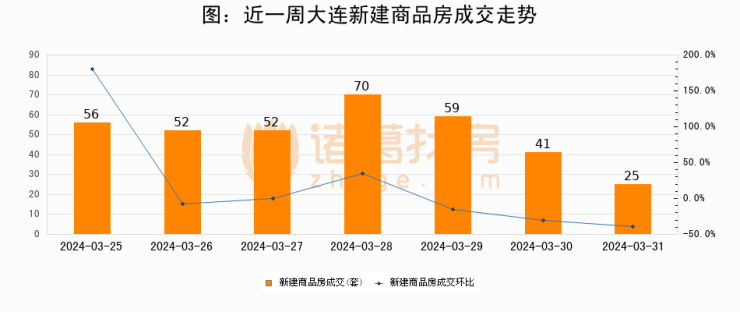 根据大连市住房保障和房屋管理局数据显示,2024年03月31日大连新建商品房成交25套,较昨日减少16套,环比下降39%
