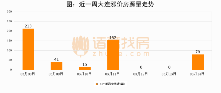根据诸葛找房数据显示,大连24小时涨价房源量为79套,较03月13日增加79套,环比上涨0%。与此同时,涨价房源占比小幅扩大,业主信心有所提升。