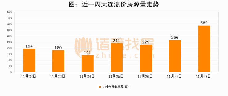 根据诸葛找房数据显示,大连24小时涨价房源量为389套,较11月27日增加123套,环比上涨46.2%。与此同时,涨价房源占比小幅扩大,业主信心有所提升。