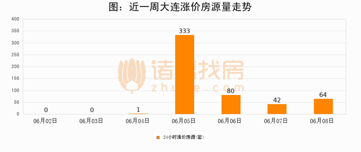 根据诸葛找房数据显示,大连24小时涨价房源量为64套,较06月07日增加22套,环比上涨52.4%。与此同时,涨价房源占比小幅扩大,业主信心有所提升。