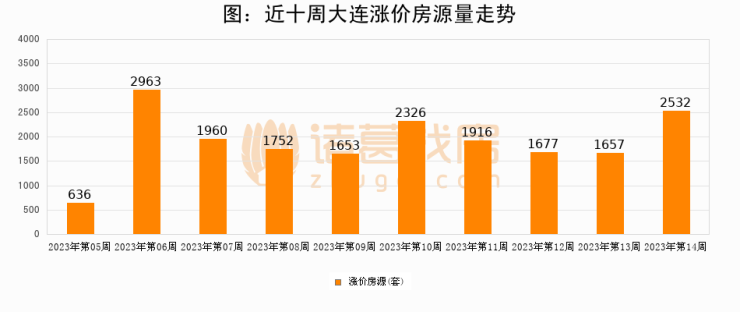 从调价房源来看,第14周大连涨价房源2532套,较上周上涨52.8%。与此同时,14周涨价房源占比提升3.03个百分点,业主信心持续恢复。