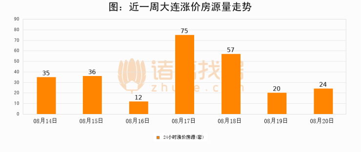 根据诸葛找房数据显示,大连24小时涨价房源量为24套,较08月19日增加4套,环比上涨20%。与此同时,涨价房源占比小幅扩大,业主信心有所提升。