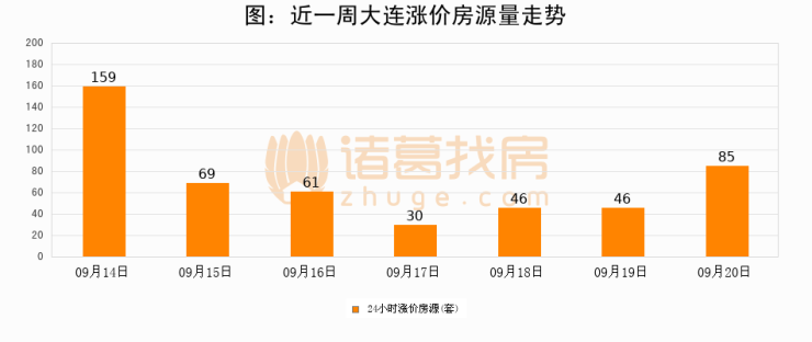 根据诸葛找房数据显示,大连24小时涨价房源量为85套,较09月19日增加39套,环比上涨84.8%。与此同时,涨价房源占比小幅扩大,业主信心有所提升。