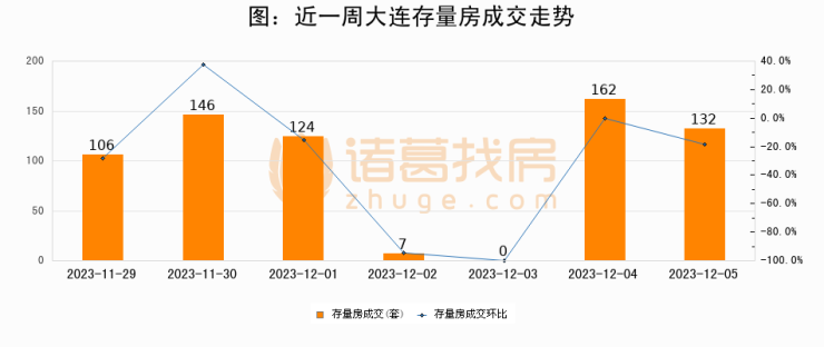 从存量房来看,2023年12月05日大连存量房单日成交132套,比昨日减少30套,环比下降18.5%。从近一周存量房成交来看,大连存量房日均成交套数为96套,12月05日单日成交132套,高于近一周平均水平37.5%。