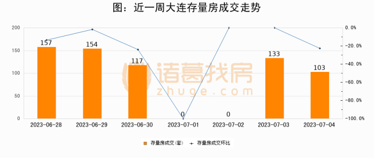 从存量房来看,2023年07月04日大连存量房单日成交103套,比昨日减少30套,环比下降22.6%。从近一周存量房成交来看,大连存量房日均成交套数为94套,07月04日单日成交103套,高于近一周平均水平9.6%。