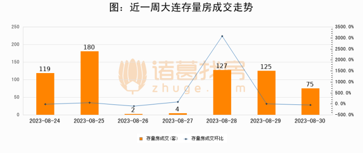 从存量房来看,2023年08月30日大连存量房单日成交75套,比昨日减少50套,环比下降40%。从近一周存量房成交来看,大连存量房日均成交套数为90套,08月30日单日成交75套,低于近一周平均水平16.7%。