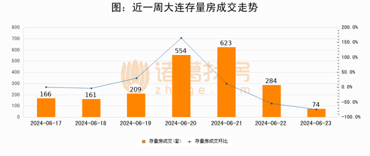 从存量房来看,2024年06月23日大连存量房单日成交74套,比昨日减少210套,环比下降73.9%。从近一周存量房成交来看,大连存量房日均成交套数为295套,06月23日单日成交74套,低于近一周平均水平74.9%。