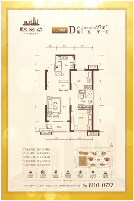 【恒大城市之光】东港核芯,建面约92-144㎡东港华宅,建面约53-107㎡格调LOFT,带装修,分期付款首期10万起。建面约97㎡宽境两居,劲销东港,欲购从速,好房不等人。