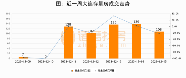 从存量房来看,2023年12月15日大连存量房单日成交108套,比昨日减少31套,环比下降22.3%。从近一周存量房成交来看,大连存量房日均成交套数为88套,12月15日单日成交108套,高于近一周平均水平22.7%。