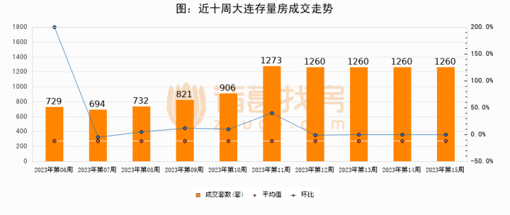 存量房方面,第15周大连存量房成交1260套,较上周持平。从近十周成交走势来看,周均成交套数为1019套,本周高于平均水平23.7%。