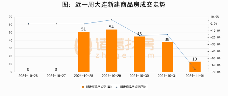 根据大连市住房保障和房屋管理局数据显示,2024年11月01日大连新建商品房成交13套,较昨日减少25套,环比下降65.8%