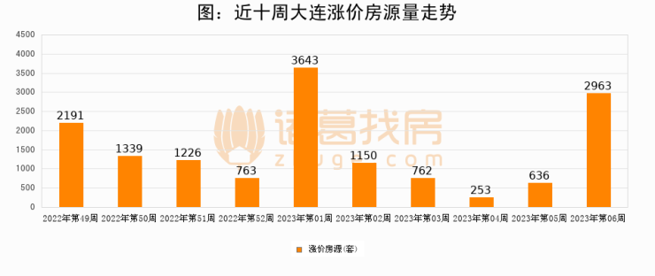 从调价房源来看,第6周大连涨价房源2963套,较上周上涨365.9%。与此同时,6周涨价房源占比回落2.18个百分点,业主信心小幅波动,购房者可则需入市。
