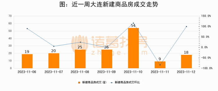 根据大连市住房保障和房屋管理局数据显示,2023年11月12日大连新建商品房成交18套,较昨日增加9套,环比上涨100%