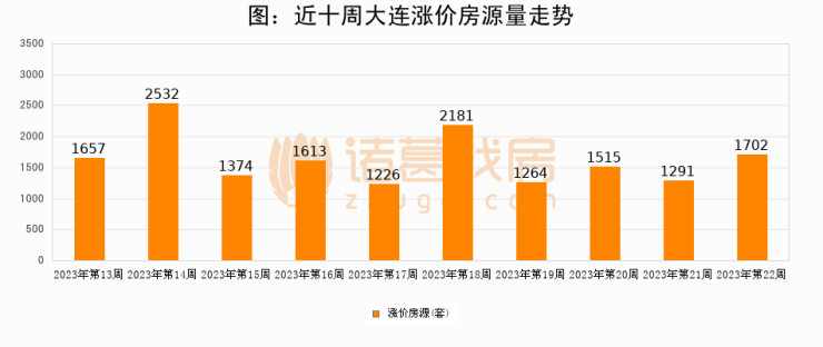 从调价房源来看,第22周大连涨价房源1702套,较上周上涨31.8%。与此同时,22周涨价房源占比提升3.27个百分点,业主信心持续恢复。