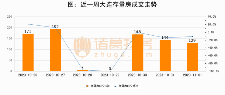 从存量房来看,2023年11月01日大连存量房单日成交129套,比昨日减少15套,环比下降10.4%。从近一周存量房成交来看,大连存量房日均成交套数为115套,11月01日单日成交129套,高于近一周平均水平12.2%。