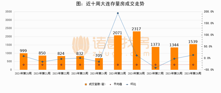 存量房方面,第29周大连存量房成交1539套,较上周增加195套,环比上涨14.5%。从近十周成交走势来看,周均成交套数为1285套,本周高于平均水平19.8%。